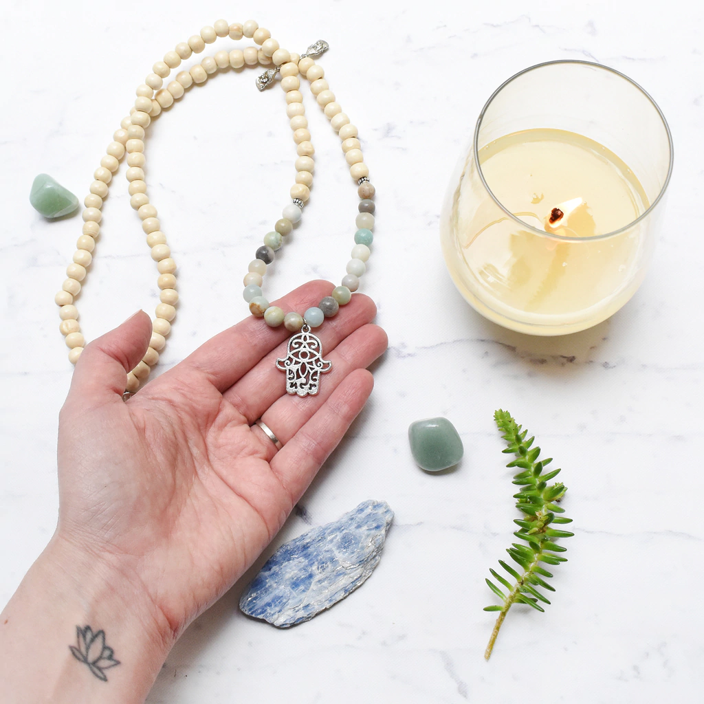 Japa Mala de 108 cuentas de 8mm de piedra Amazonita (genuina) y madera, con amuleto Hamsa de 3cm de alto.